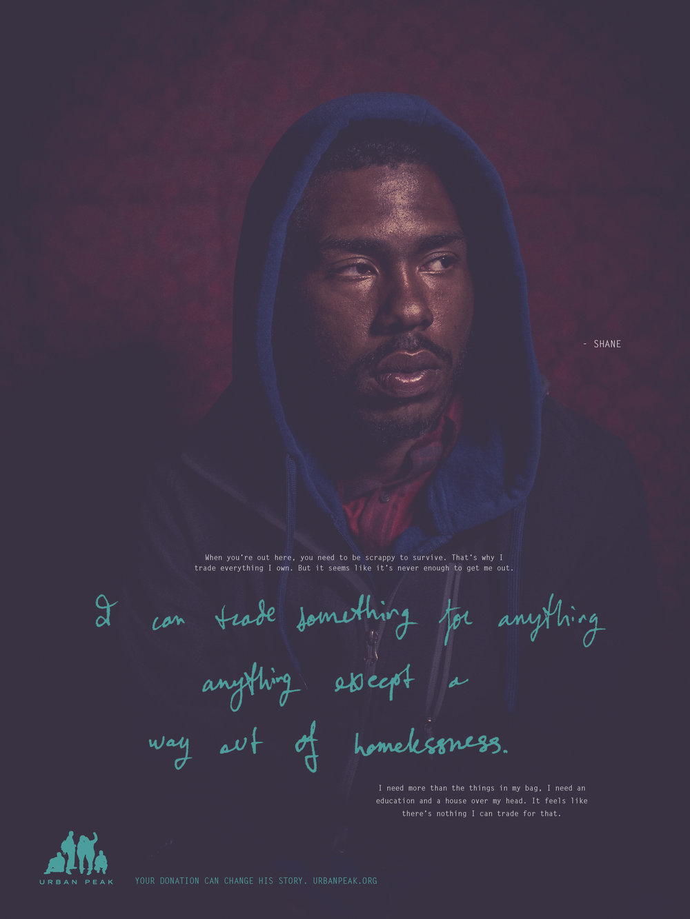Telling the unseen stories of young homeless people to drive awareness and donations to Urban Peak, Colorado’s resource for homeless youth.